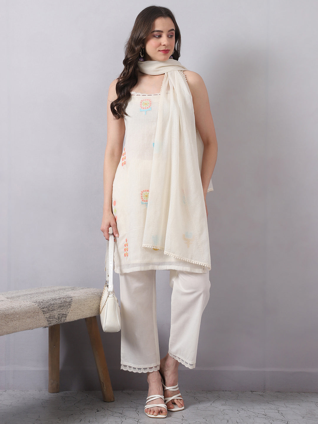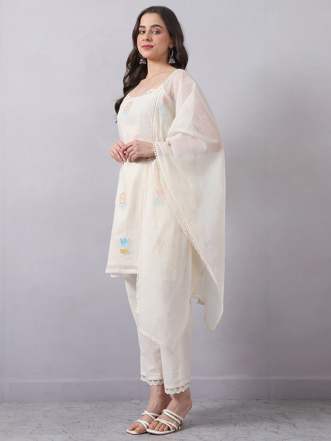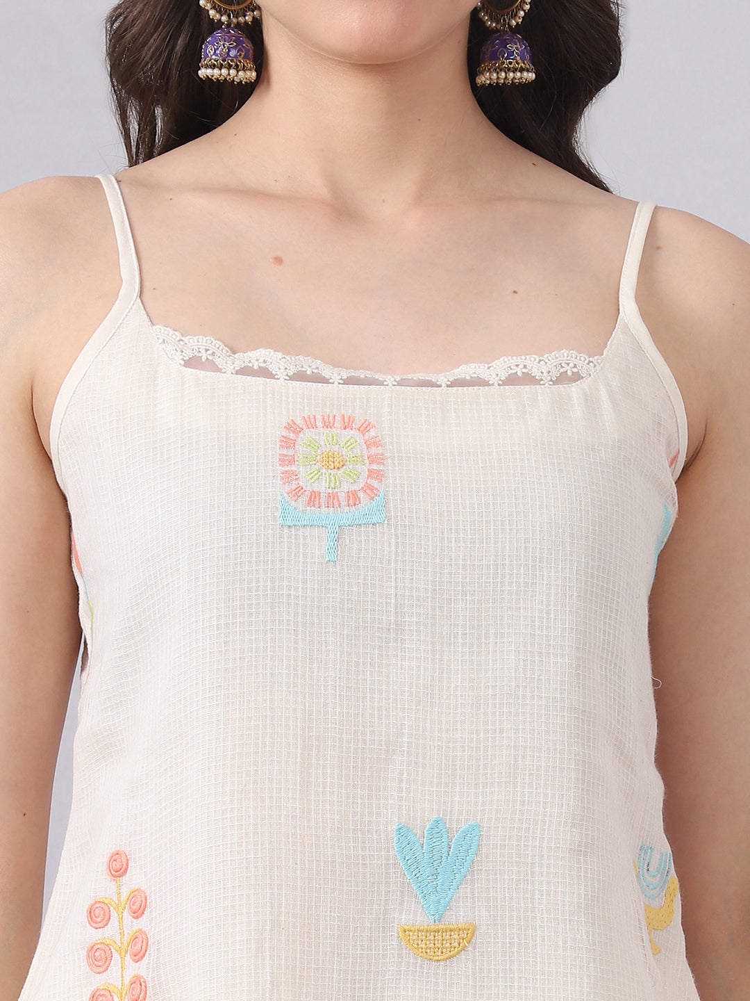 A light and easy sleeveless kurta set crafted in premium Kota Doria, designed for a breathable and comfortable feel. The kurta features soft multicolor embroidery with delicate lace detailing, giving it a subtle and elegant look.