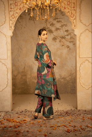 This vibrant A-line kurta set is tailored in viscose muslin with abstract floral motifs. Featuring embroidery on the neckline, sleeves, and slit, along with cotton lace accents and viscose organza detailing on both kurta and pants.