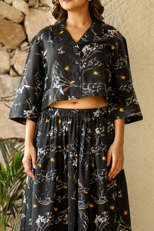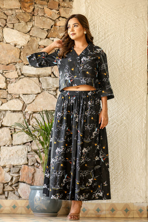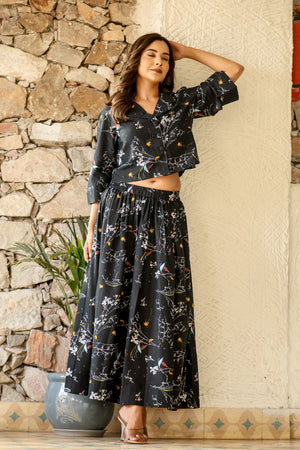 Black Multi-Color Printed Crop Top & Skirt Set in Natural Rayon