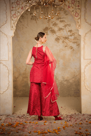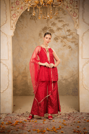 The neckline is accentuated with tassel detailing, bringing in a subtle playfulness to the look. Paired with wide-leg pants and a sheer dupatta, this ensemble is ideal for festive brunches, poojas, or intimate celebrations.