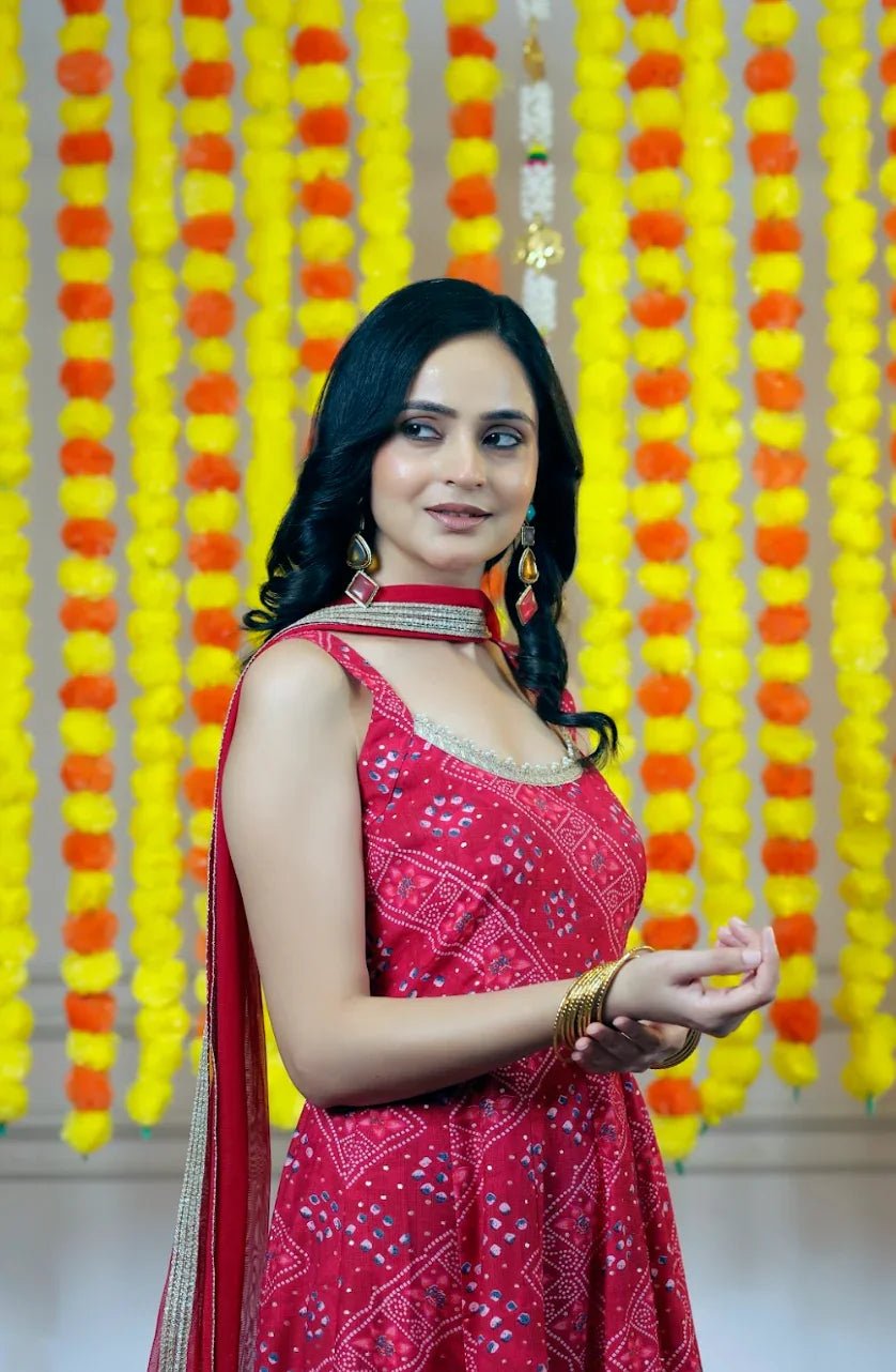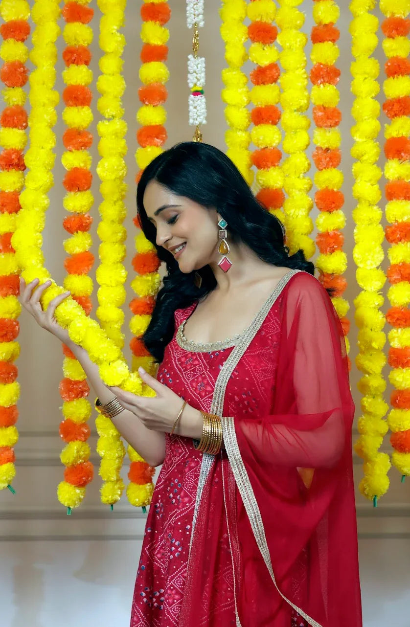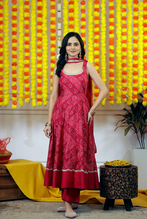This elegant flex muslin Anarkali kurta set features a slim-fit Anarkali kurta paired with matching pants and a net dupatta.