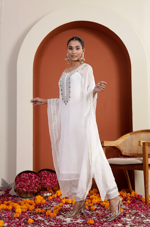 This elegant hand-embroidered silk organza kaftaan set is designed as a refined 2-piece ensemble featuring an inner kurta. The top is crafted in premium silk-blend organza, paired with a comfortable cotton satin bottom.