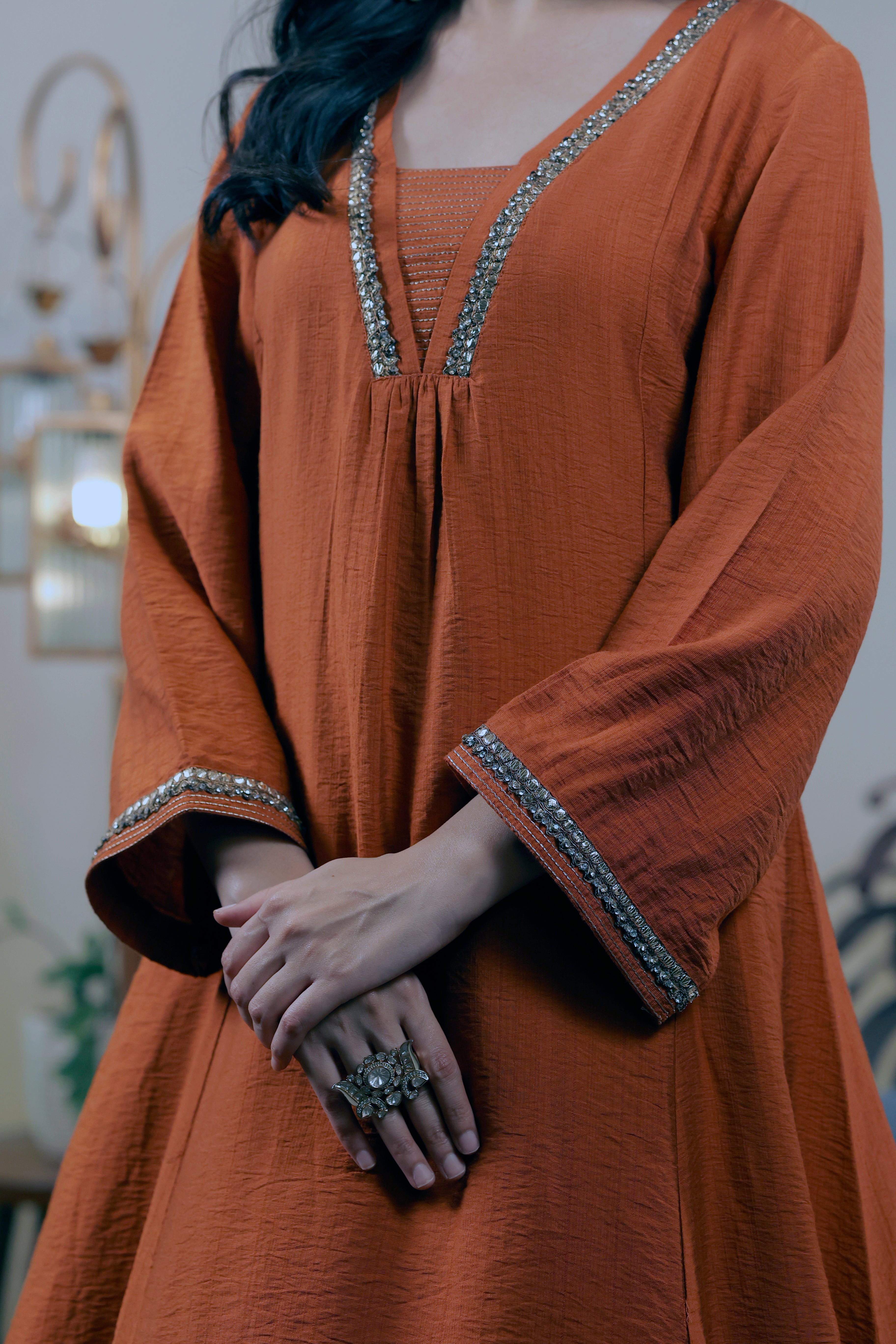 This elegant hand-lace detailed kurta & pant set features handmade lace detailing on the kurta, paired with matching pants accented with delicate lace. Crafted in a comfortable silk/nylon viscose blend, this regular-fit ensemble offers subtle elegance and ease.