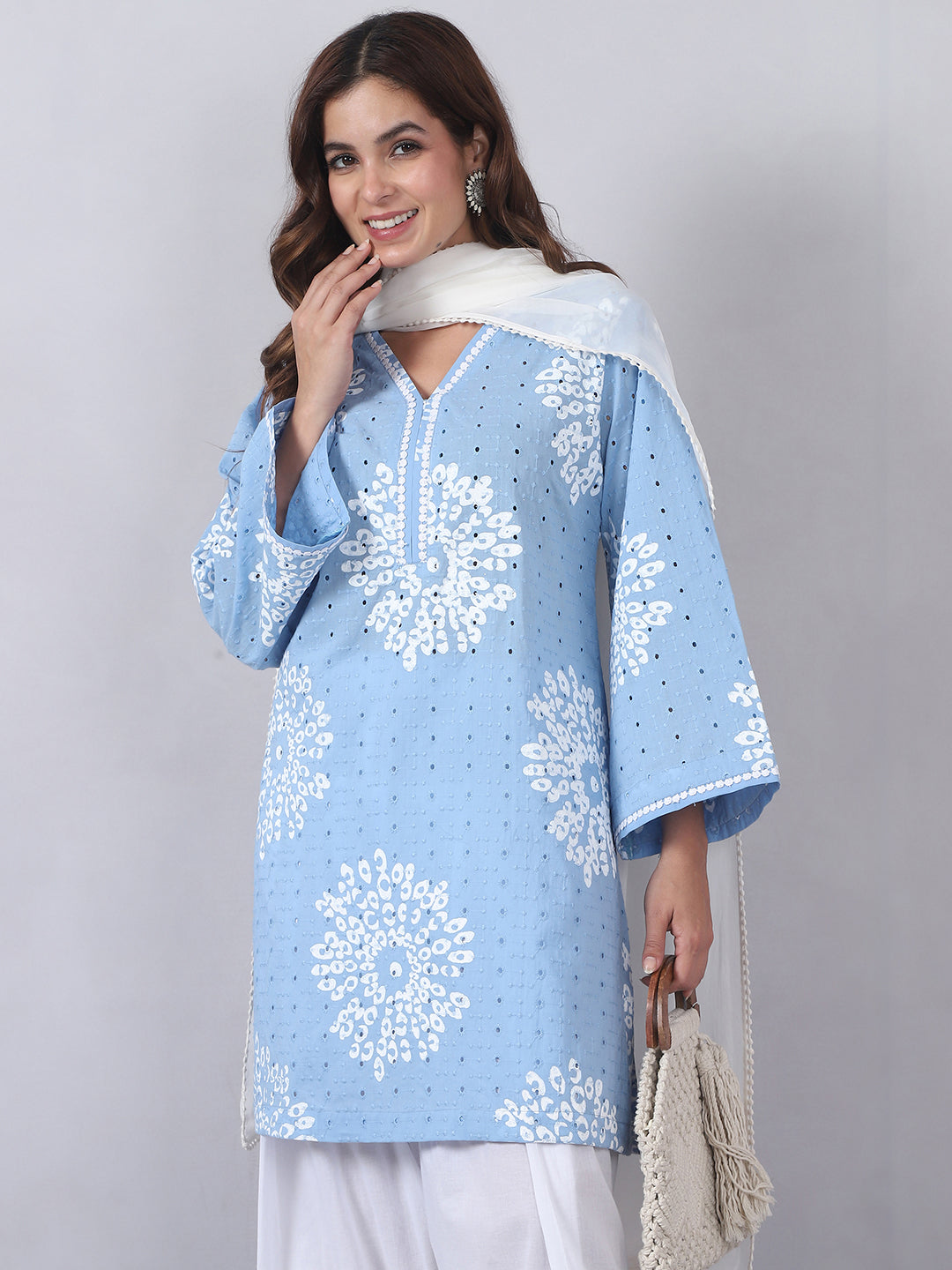 Crafted in soft cotton cambric, this powder blue kurta set brings together delicate schiffli embroidery and handblock prints in a way that feels light and effortless. The fabric breathes well, and the embroidery adds just the right amount of detail without feeling overdone.