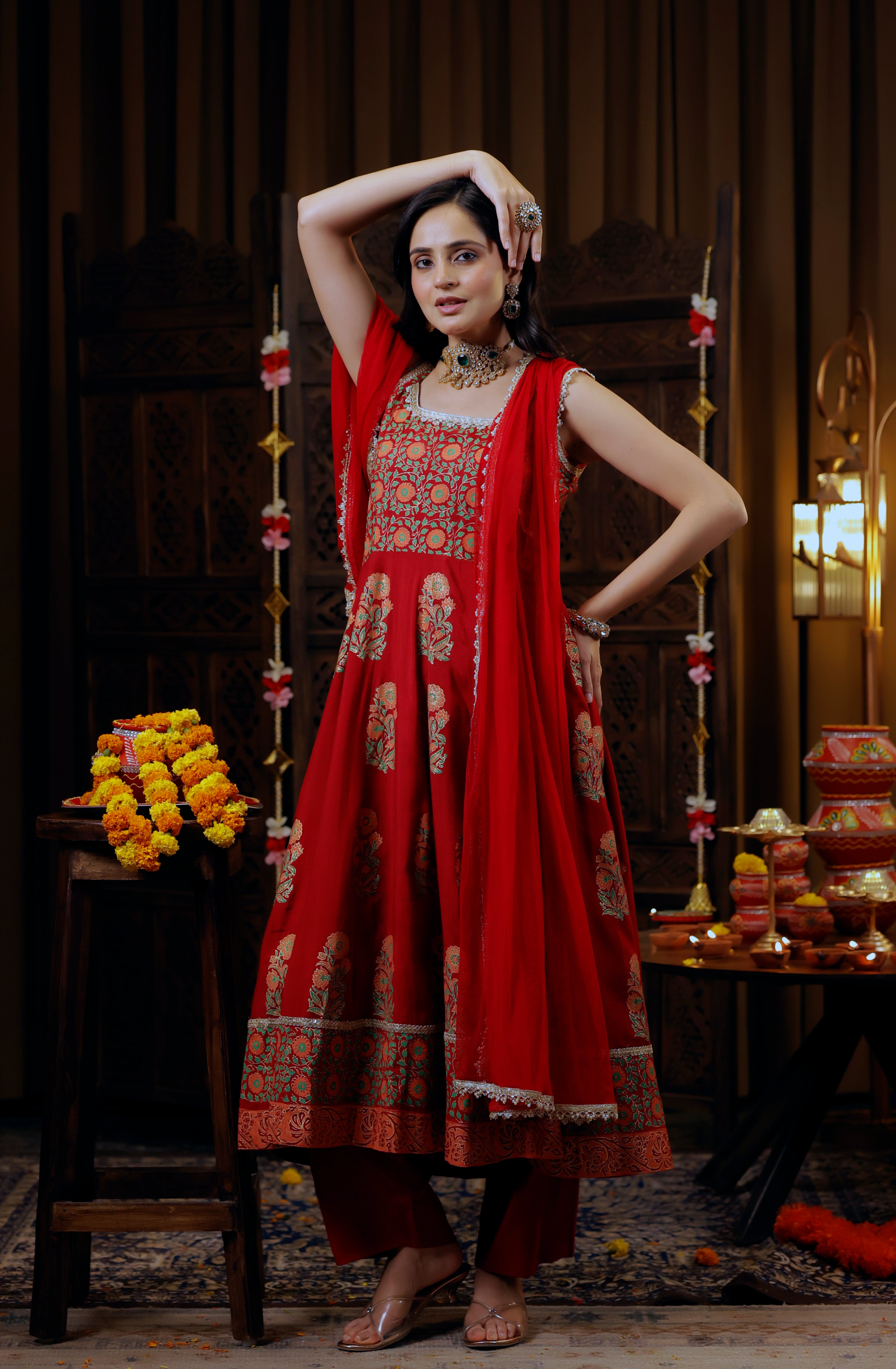 This graceful viscose shantoon Anarkali set features delicate hand block prints complemented by lace detailing on the neckline and hem.