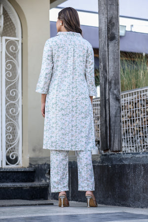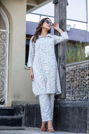 Stay effortlessly stylish in this chic 2-piece co-ord set, featuring a classic shirt collar design with a soothing white base and blue print. Made from breathable and soft natural rayon fabric, this set offers all-day comfort with a refined look.