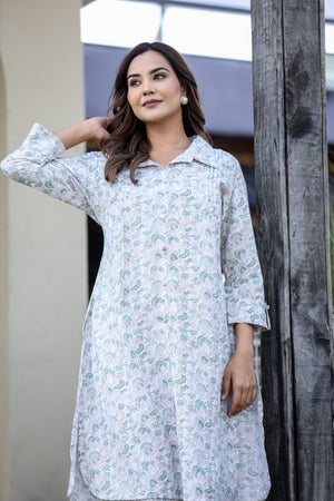 White & Blue Printed Shirt Collar Coord Set in Natural Rayon