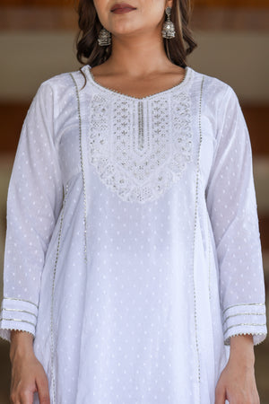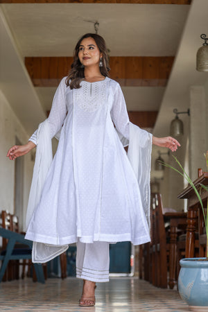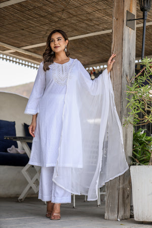 Classic and graceful, this white SKD suit set is crafted from breathable and textured zeera dot dobby cotton, perfect for warm weather and everyday elegance. The kurta is beautifully enhanced with patch embroidery on the yoke and sleeves, adding subtle detailing and artisanal charm